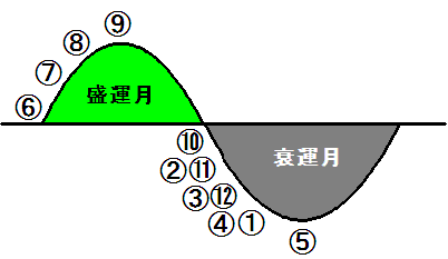 ただ、果実なら完熟、月なら満月状態ゆえ、それ自体は良いことだが、その後は食われるか、欠けて行くのだから、中庸を尊ぶ易の哲理によると決して好ましい状態でないことになる。しかし、9の倍数年前に人生の第一歩を踏み出した同じ年で、だれもが「おめでとう」と云っても「ご愁傷様」と云う人はないのだから、気学では最強運と判断する以外にない。