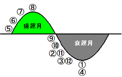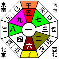 二黒土星は北西に回座する。季節なら秋で人類の主食となる五穀は取り入れの時期を迎える。つまり充実期を迎えるので九星術では盛運と判断することが多い。果物が充実するということは完熟することだから、その後は食われてしまうか落果の道しかない。したがって、一白の欄に記したように、易の哲理を取り入れた気学ではこの時期から5年間の衰運期を迎えたと判断する。