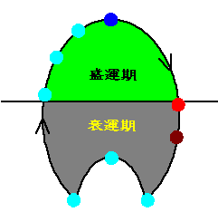 二黒土星は北西に回座する。季節なら秋で人類の主食となる五穀は取り入れの時期を迎える。つまり充実期を迎えるので九星術では盛運と判断することが多い。果物が充実するということは完熟することだから、その後は食われてしまうか落果の道しかない。したがって、一白の欄に記したように、易の哲理を取り入れた気学ではこの時期から5年間の衰運期を迎えたと判断する。